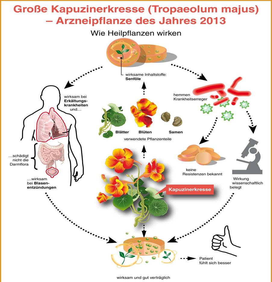 Dabei ist das Wirkprinzip wie folgt: In den Heilpflanzen sind Senföle in einer inaktiven, stabilen Form enthalten, man spricht dann von Senfölglycosiden oder Glucosinolaten. Aus dieser inaktiven Form werden nach dem Schlucken durch Umwandlung mittels eines in Kapuzinerkresse und Meerrettich enthaltenen Pflanzenstoffes (Myrosinase) bereits im Magen Senföle freigesetzt, welche die eigentlichen antimikrobiell aktiven Substanzen darstellen. Bereits im oberen Darmabschnitt werden die Senföle dann schnell und vollständig resorbiert, also ins Blut aufgenommen. Auf diesem Wege gelangen die Senföle schließlich zu ihren Ausscheidungsorganen, der Harnblase und der Lunge, und reichern sich dort an. Hier entfalten die Senföle ihre antibakterielle und antivirale Wirkung.
