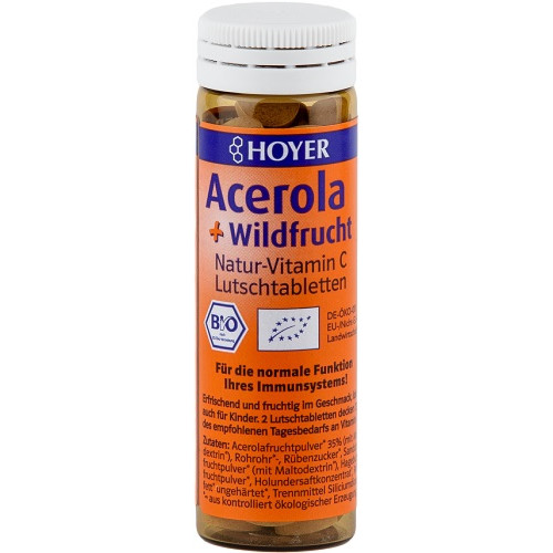 Die Vitamin C-reichste Frucht der Welt ist die in Südamerika beheimatete Acerola, die wegen ihrer orange-roten Farbe und der Größe „Kirsche” genannt wird. Sie besitzt einen 20-30 mal höheren Vitamin C-Gehalt als Orangen oder Zitronen. Durch die ideale Kombination mit den Vitamin C-reichen Wildfrüchten Hagebutte, Sanddorn und Holunder, liefern HOYER Acerola & Wildfrucht Tabletten viel schützendes Vitamin C in spezieller Verbindung mit wichtigen natürlichen Begleitstoffen.