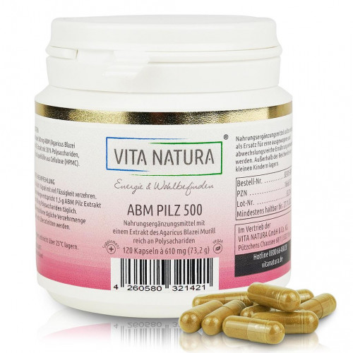 Je Kapsel 500 mg ABM (Agaricus Blazei Murill) Extrakt mit 30 % Polysacchariden, VCaps Kapselhülle aus Cellulose (HPMC).