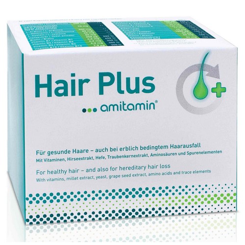 amitamin® Hair Plus bietet eine optimierte Nährstoffversorgung für gesunde Haare – mit L-Arginin, Hirsesamenextrakt, Traubenkernextrakt und vielen Vitaminen und Mineralstoffen. Die in amitamin® Hair Plus enthaltenen Mikronährstoffe tragen zur Erhaltung normaler Haare[1], gesunder Haut und Kopfhaut[2] sowie zur normalen Haarpigmentierung[3] bei. Haare werden vom Körper mit speziellen Eiweißbausteinen (L-Methionin, L-Cystein) aufgebaut. Diese Aminosäuren sind zusammen mit LArginin auch in amitamin® Hair Plus enthalten.