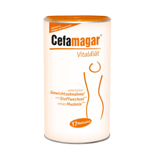 Cefamagar® Vitaldiät ist allein kein vollständiges Lebensmittel. Das Ersetzen von 2 Mahlzeiten pro Tag durch Cefamagar® Vitaldiät trägt im Rahmen einer kalorienarmen, abwechslungsreichen und ausgewogenen Ernährung (Salat, Gemüse, Obst, Vollkorn etc.) mit ausreichender Flüssigkeitszufuhr (ca. 2L ungesüsster Tee, Wasser) zur Gewichtsabnahme bei (*). Der hohe Eiweißanteil in einer Mahlzeit Cefamagar® Vitaldiät sorgt für den Erhalt und den Aufbau von Muskelmasse (**). Die Inhaltsstoffe Magnesium, Mangan, Calcium, Eisen, Iod, Kupfer, Phosphor, Pantothensäure, Niacin und die Vitamine B1, B2, B6, B12 und C unterstützen einen normalen Energie-Stoffwechsel (***). Achten Sie auch auf eine aktive und gesunde Lebensweise. Bei langfristigen Reduktionsdiäten ist die Beratung durch den Arzt empfehlenswert.
