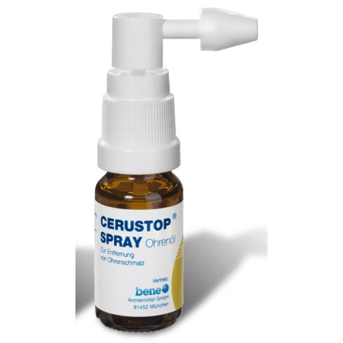 Mit CERUSTOP® Ohrenöl-Spray entfernen Sie überschüssiges oder verhärtetes Ohrenschmalz (Cerumen) ganz einfach. Die physiochemischen Eigenschaften des Produkts lassen es tief in das Schmalz eindringen und lösen es an. Außerdem reinigt CERUSTOP® die Ohrmuschel und den äußeren Gehörgang schonend. Die hautpflegenden Inhaltsstoffe Mandelöl und Vitamin E schützen Ihre Haut vor dem Austrocknen und lösen gleichzeitig verhärtetes Ohrenschmalz. CERUSTOP® Ohrenöl-Spray kommt ohne Glycerol aus und reizt das Ohr nicht.