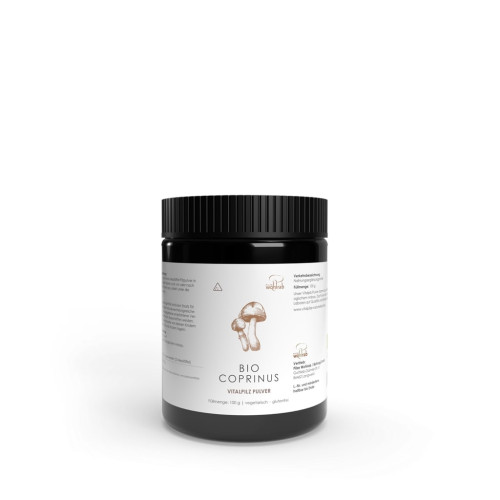 Den Vitalpilz Coprinus kennt man auch unter seinem deutschen Namen Schopftintling. Wie der Name schon andeutet, zerfließt der Pilz, wenn er altert zu einer schwärzlichen, an Tinte erinnernden Flüssigkeit. Getrocknet ist er jedoch lange haltbar. Bei diesem Produkt handelt es sich um loses Pulver des Coprinus. Die erntefrisch getrockneten Schopftintlinge werden für dessen Herstellung fein zermahlen. Das Pulver ist vegan, Bio-zertifiziert (ÖKO-Kontrollstelle: DE-ÖKO-006), gluten- sowie lactosefrei und frei von Zusatzstoffen.