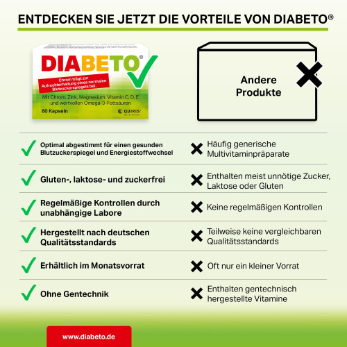 Nur unter ärztlicher Aufsicht verwenden. Ergänzende bilanzierte Diät, nicht zur ausschließlichen Ernährung geeignet. Nicht bei Fisch- oder Sojaallergie verwenden. Außerhalb der Reichweite von Kindern aufbewahren. DIABETO® ist keine Ersatz für eine abwechslungsreiche und ausgewogene Ernährung und eine gesunde Lebensweise.