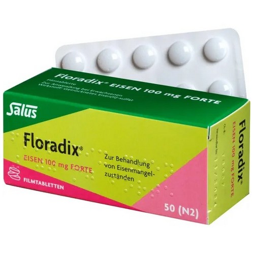 Eisen(II)-sulfat 1 H2O. Anwendungsgebiet: Floradix® Eisen 100 mg forte Filmtabletten wird zur Behandlung von Eisenmangelzuständen eingesetzt.