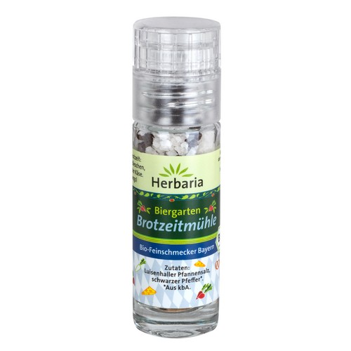 Herbaria Biergarten-Brotzeitmühle ist ein Bio-Gewürzsalz für die typisch bayerische Brotzeit in der Mini-Mühle. Die klassische Mischung aus Luisenhaller Pfannensalz und schwarzem Pfeffer eignet sich für jeden und jede Brotzeit. Harmonische Kombination aus dem Luisenhaller Pfannensalz mit seiner milden Würze und dem schwarzen Pfeffer aus Sri Lanka, welcher eine intensive Schärfe und ein starkes volles Aroma besitzt. Die Biergarten-Brotzeitmühle ist der ideale Begleiter einer typisch bayerischen Brotzeit. Ob auf Tomaten, Radieschen, Rettich, Gurken, Käse oder Eiern. Mit der Mühle auf dem Tisch, kann alles direkt und einfach nachgewürzt werden. Einfach frisch über das Essen mahlen und genießen!