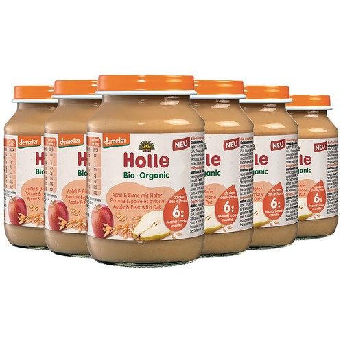 Das Holle Babygläschen Apfel & Birne mit Hafer mit feinen Früchten und wertvollem Getreide für ein pures Geschmackerlebnis.