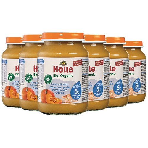 Das erste Menü mit Fleisch. Das herzhafte Püree des Babygläschens aus Gemüse und wertvollem Hühnchenfleisch lässt sich schnell zubereiten.