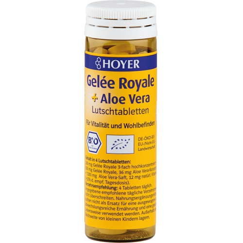 HOYER Gelée Royale + Aloe Vera Tabletten kombinieren Gelée Royale, Nährstoff der Bienenkönigin, mit den vielfältigen Eigenschaften der mythenumwobenen Pflanze Aloe Vera in wohlschmeckenden Kautabletten. Kombiniert mit Vitamin C aus der Acerolakirsche entsteht so eine wertvolle Nahrungsergänzung natürlicher Substanzen.