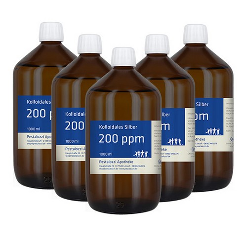 5 x 1000 ml "Kolloidales Silber - Pestalozzi Apotheke" in lichthemmender Apothekerbraunglasflasche