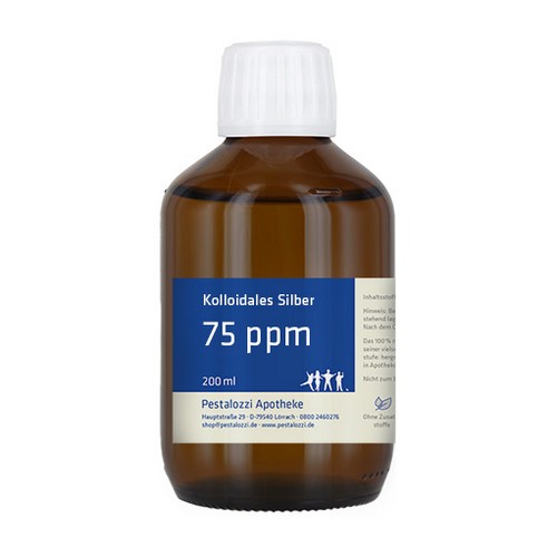Das kolloidale Silber 75 ppm wird mit hochreinem destillierten Wasser unter qualifizierten Laborbedingungen frisch hergestellt und in einer dunklen Glasflasche geliefert. Die Herstellung erfolgt in der Apotheke unter überwachten Laborbedingungen. Das kolloidale Silber wird auf elektrolytischem Wege mit Hilfe eines entsprechenden Generators hergestellt. Dabei werden aus 99,99% reinem Silber kleinste Partikel gebildet und in destilliertem Wasser verteilt. Wir arbeiten dabei ohne Einsatz von Zusatzstoffen. Bitte beachten Sie: Kolloidales Silber ist kein Arzneimittel und daher auch ohne Angabe einer Indikation. Aus rechtlichen Gründen bieten wir daher das kolloidale Silber nur für technische Zwecke an. Nicht zum Einnehmen.