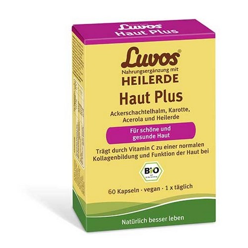 Luvos Haut Plus ist ein optimal abgestimmter Bio-Komplex mit Heilerde und bio-zertifizierten pflanzlichen Zutaten. Das hochwertige Naturprodukt enthält neben Heilerde Bio-Ackerschachtelhalm mit einem hohen Silizium-Gehalt, Bio-Karotte und den Bio-Enhancer Piperin aus Schwarzem Pfeffer. Vitamin C, enthalten in der Bio-Acerola-Kirsche, trägt zur normalen Kollagenbildung für eine normale Funktion der Haut bei und schützt die Zellen vor oxidativem Stress. Dies unterstützt wirkungsvoll die Versorgung der Haut, was ihr eine natürliche, gesunde Ausstrahlung verleiht. Eine Kapsel täglich reicht aus.