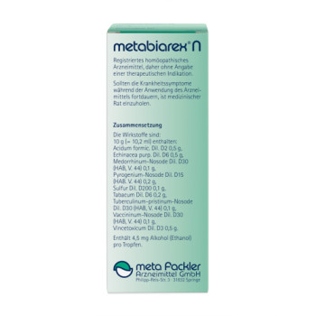 Zur Dosierung, Dauer und Anwendung befragen Sie bitte Ihren homöopathisch erfahrenen Therapeuten. Wegen des Säuregehaltes soll metabiarex N nicht unverdünnt, sondern immer mit etwas Flüssigkeit eingenommen werden.