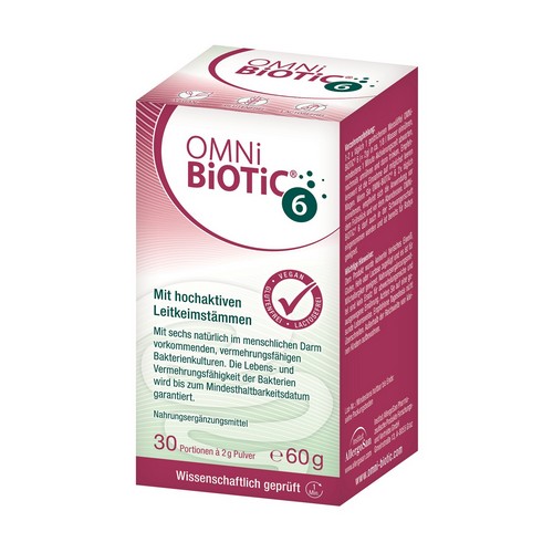 OMNi-BiOTiC® 6 enthält sechs wichtige, hochaktive Leitkeimstämme, die den Darm von oben bis unten besiedeln. Es darf auch in der Schwangerschaft eingenommen werden und ist bereits für Babys geeignet.