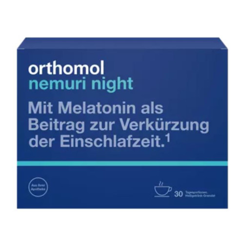 Orthomol Nemuri night ist ein Nahrungsergänzungsmittel mit Melatonin, Nährstoffen (Magnesium, Niacin, Vitamin B₆, Glycin und L-Tryptophan) und Pflanzenextrakten (Hopfen-, Melissen- und Grüntee-Extrakt). Das Granulat kann vor dem Schlafengehen als Heißgetränk getrunken werden.