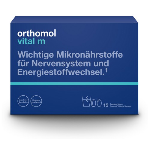 Orthomol Vital m ist ein Nahrungsergänzungsmittel mit Zuckern und Süßungsmittel. Wichtige Mikronährstoffe für Nervensystem und Energiestoffwechsel.