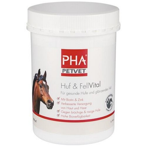 PHA Huf & FellVital ist ein Ergänzungsfuttermittel zur Unterstützung des Saumbandes und der Verbesserung der Hufoberfläche. Die Inhaltsstoffe Biotin und Zink haben eine vielseitige Bedeutung für den Zellstoffwechsel, und unterstützen so auch den Knochen- und Gelenkstoffwechsel sowie das Haut- und Haarkleid.