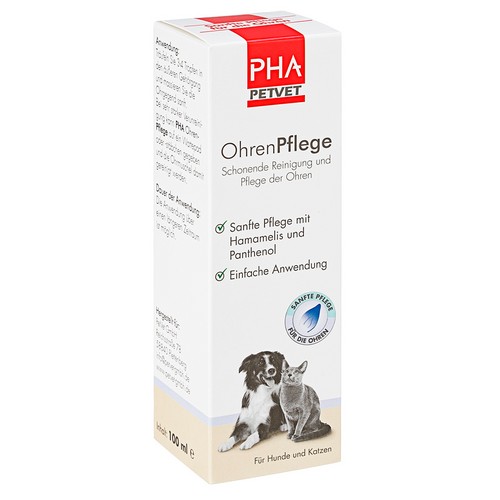 Die Ohren von Hunden und Katzen können durch äußere Einflüsse oder gestörte Selbstreinigung stark verschmutzt sein. Das kann zu unangenehmen und schmerzhaften Reizungen des äußeren Gehörgangs und der Ohrmuschel führen. Das Tier reagiert darauf mit übermäßigem Kratzen am Ohr. Dies verstärkt die Reizung der Haut im Ohrenbereich zusätzlich. Bei regelmäßiger Anwendung sorgt PHA OhrenPflege für die natürliche Selbstreinigung des äußeren Gehörgangs und beugt Entzündungen vor. Die in PHA OhrenPflege enthaltenen Wirkstoffe Panthenol und Teebaumöl pflegen und beruhigen zusätzlich die gereizte Haut des Ohres.