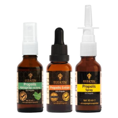 Das Must Have- Paket ist für jede Jahreszeit geeignet und besonders beliebt in den Wintermonaten. BEE&YOU Propolis Extrakt 20 % Tinktur ist für den äußerlichen und innerlichen Gebrauch geeignet. Das BEE&YOU Spray & BEE& YOU Halsspray mit Honig und Menthol ist für die lokale Anwendung und für Allergiker geeignet.