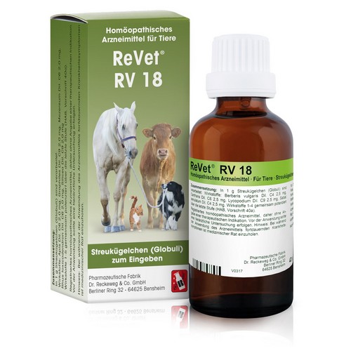 - ReVet®RV -Serie für alle Tierarten, auch für lebensmittelliefernde Tiere. Packungsgröße: 42 g Globuli.