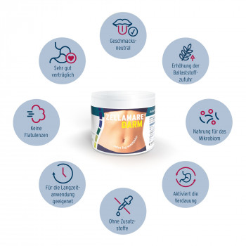 ZELLAMARE DARM ist ein Ballaststoff zum Auflösen und Trinken. Ballaststoffe sind ein wichtiger Bestandteil der Ernährung. Täglich sollten mindestens 30 g aufgenommen werden. Ist die Zufuhr zu niedrig, ist ZELLAMARE DARM eine ideale Unterstützung. ZELLAMARE DARM einfach in wenig Wasser, Kaffee, Milch oder Saft auflösen und trinken. ZELLAMARE DARM ist geschmacksneutral leicht löslich in wenig Flüssigkeit dickt nicht nach für Diabetiker geeignet sehr gut verträglich (ohne Blähungen) bürotauglich